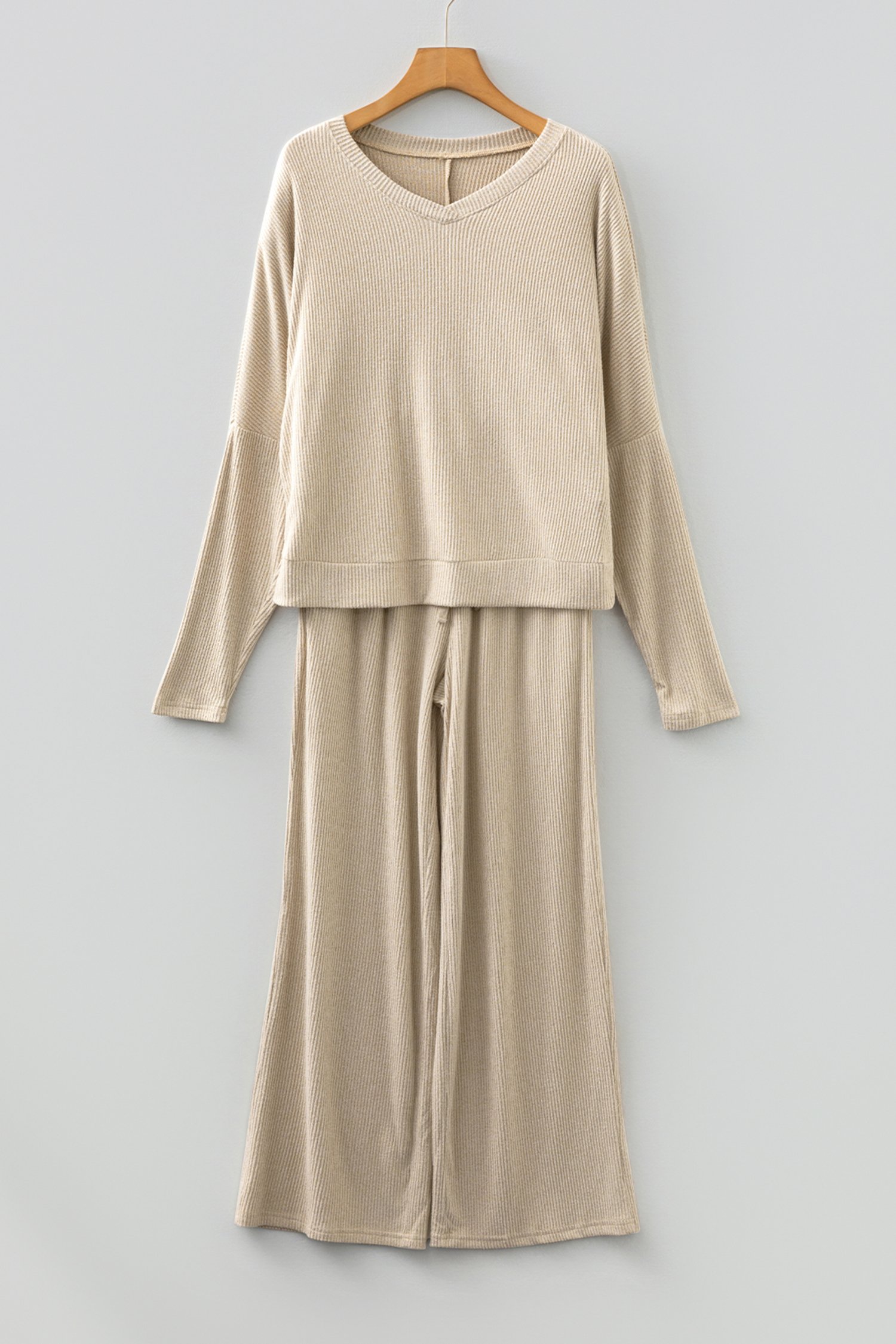 • Cozy 3D ribbed lounge set featuring a V neck pullover and drawstring pants.